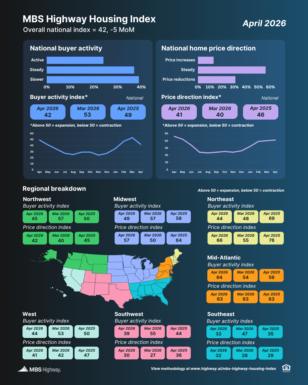 The MBS Highway National Housing Index fell 5 points in April 2026, dropping from 47 in March to 42. While national price direction remained relatively steady, buyer activity declined sharply, likely reflecting the recent rise in mortgage rates.