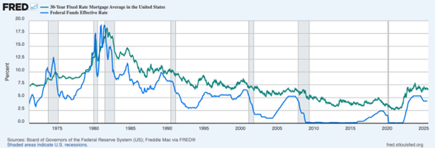 Now, let’s gain a more historical perspective. As you can see over the long run, there is a reasonably good correlation between the direction of the Fed Funds Rate and mortgage rates.
