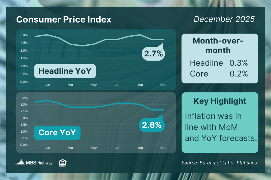 Consumer prices rose 0.3% in December and 2.7% year over year, with the annual rate unchanged from the prior report. Core inflation, which excludes food and energy, increased 0.2% for the month and held steady at 2.6% annually – its lowest level since early 2021. These readings were mostly in line with analysts’ expectations.