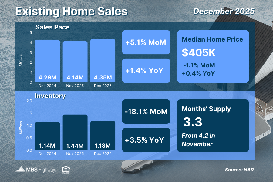 Existing home closings jumped 5.1% in December, marking a fourth consecutive monthly increase, according to the National Association of REALTORS® (NAR). Sales were also 1.4% higher than a year earlier. Housing inventory fell 18.1% from November to 1.18 million homes but was still 3.5% higher than last year.