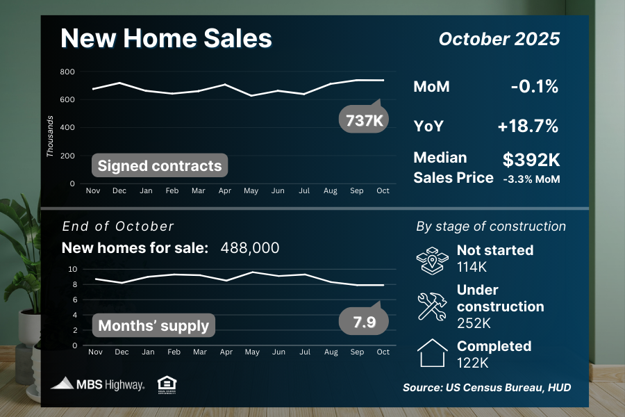 New home sales edged down 0.1% from September to October to an annualized pace of 737,000 units, according to data that had been delayed by the government shutdown. Activity stayed near the fastest pace since May 2023 and above economists’ expectations, reflecting contracts signed when mortgage rates were easing.