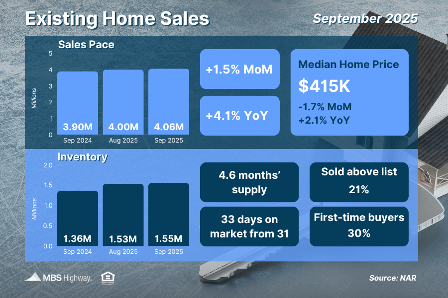 The National Association of REALTORS® (NAR) reported that existing home closings rose 1.5% from August to September, slightly below expectations but still 4.1% higher than a year ago. Inventory increased to 1.55 million units, matching a five-year high, though remaining below pre-COVID levels.