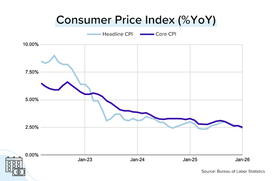 January CPI moved much lower. Headline CPI (Consumer Price Index = inflation for you and me) dropped to +2.4% YoY (from +2.7%), and “core” eased to +2.5% YoY (from +2.7%). That’s the lowest “core” reading we’ve had since March 2021. [BLS]