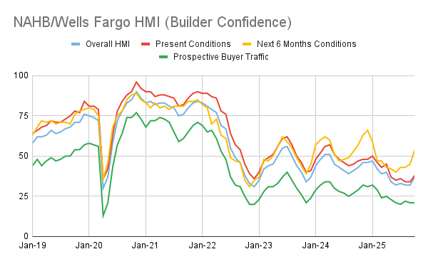 Builder confidence boosted. The National Association of Homebuilder’s confidence index jumped from 32 → 37 in October (highest since April 2025) and its forward-looking sub-index (outlook for the next 6 months) rocketed from 45 → 54. [NAHB]