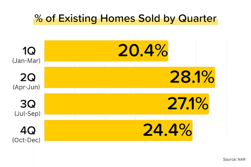 ’Tis the seasonality. You know that real estate is a seasonal business, but do you know how seasonal? If transaction volumes were spread equally across the year, you’d expect 25% of sales to happen each quarter. What actually happens is that spring (2Q = April-June) is the strongest month (28% of annual sales), followed closely by summer (3Q =July-September). Things start to slow down in the fall/early winter (4Q = Oct-Dec), but it’s the first quarter (1Q = January-March) that is the slowest by far.